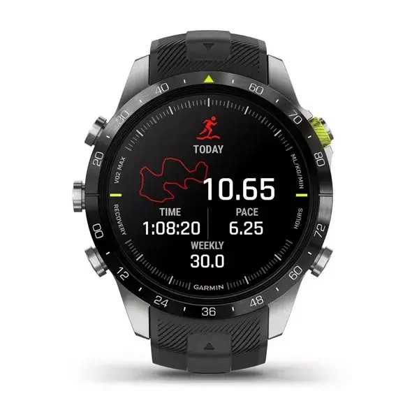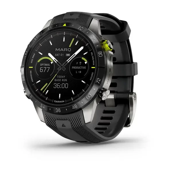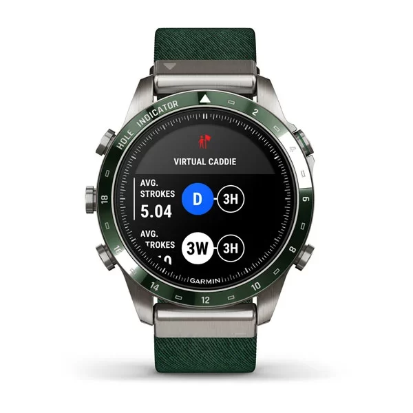 Премиальные смарт-часы Garmin MARQ Golfer 2-го поколения, с ярким AMOLED дисплеем, сенсорным/кнопочным управлением, сапфировым стеклом, керамическим безелем, титановым корпусом и жаккардовым нейлоновым ремешком. В комплекте датчики Approach CT10 и дополнительный силиконовый ремешок.